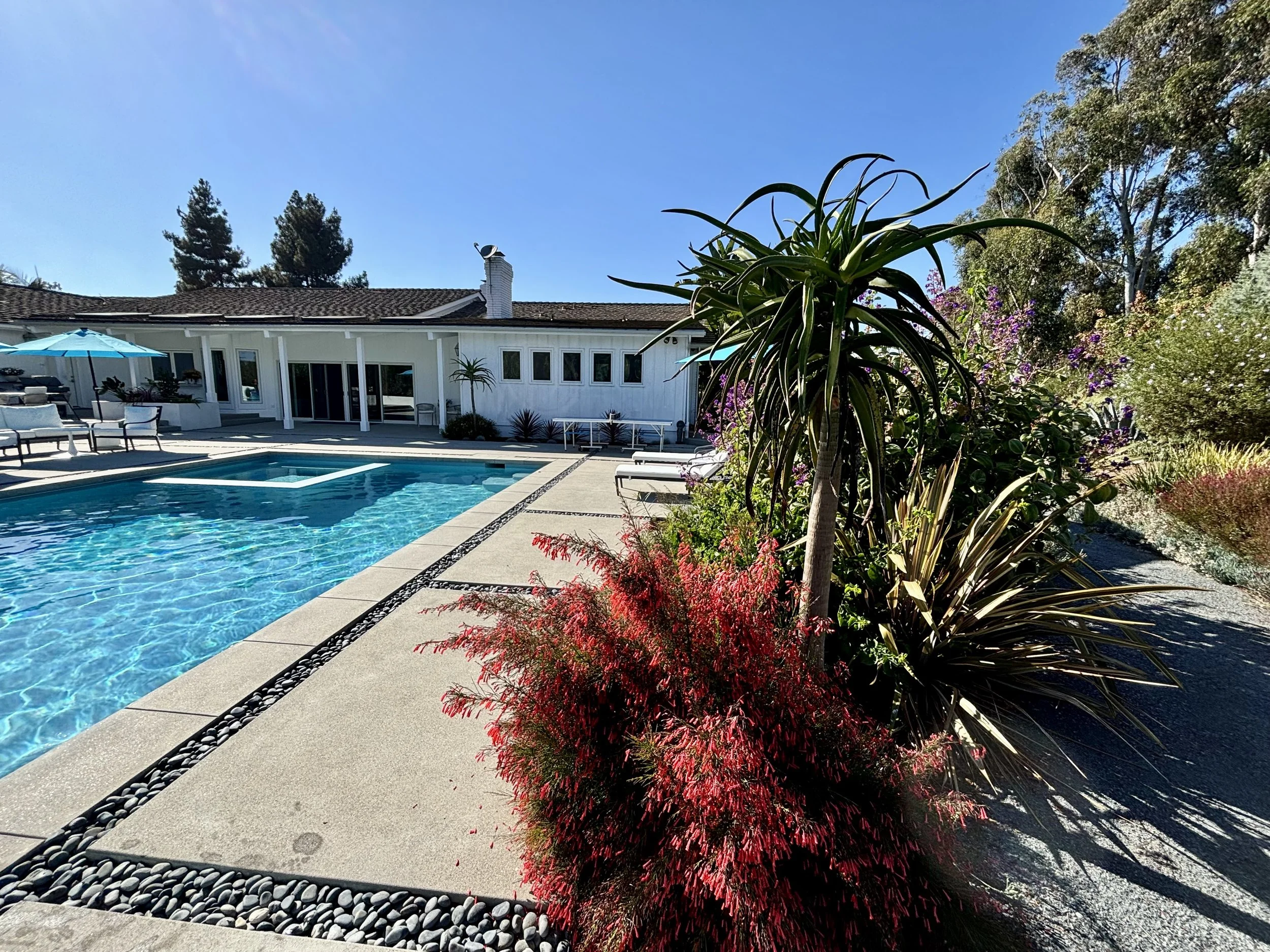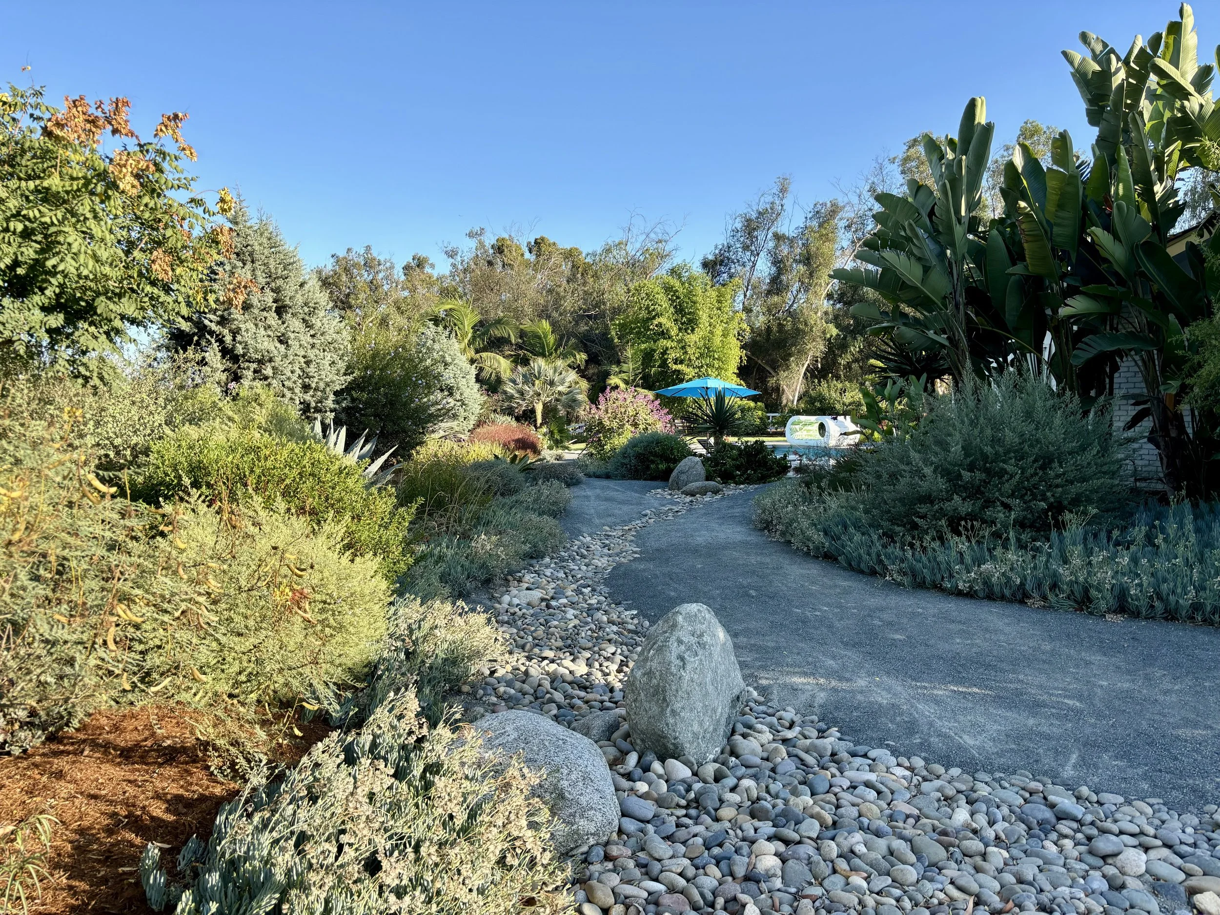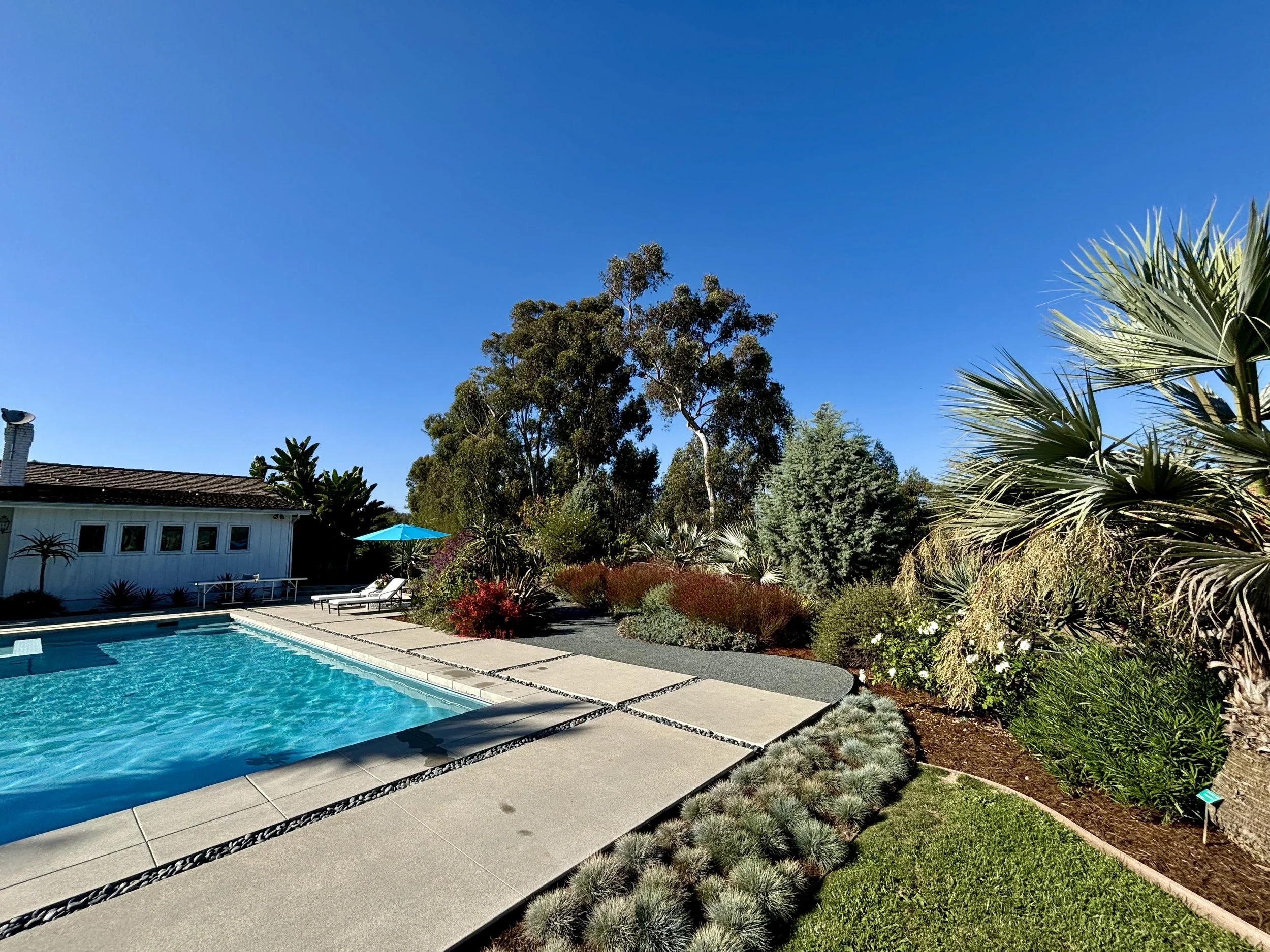 **Key incentive:** We enrolled in California’s *Turf Replacement Program*, which provided **$2 per square foot** up to a **$10,000 maximum**. We targeted the highest-impact 5,000 sq ft around the house and pool, securing the full **$10,000 rebate**—a smart boost that offset permitting and demo costs. Drip irrigation on smart controllers now feeds the landscape, and recycled barn runoff irrigates the orchard.
