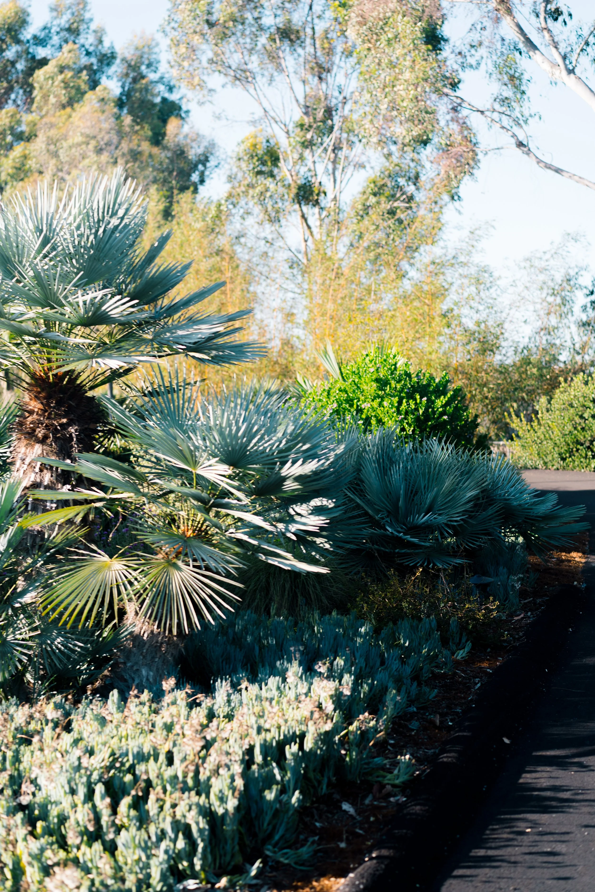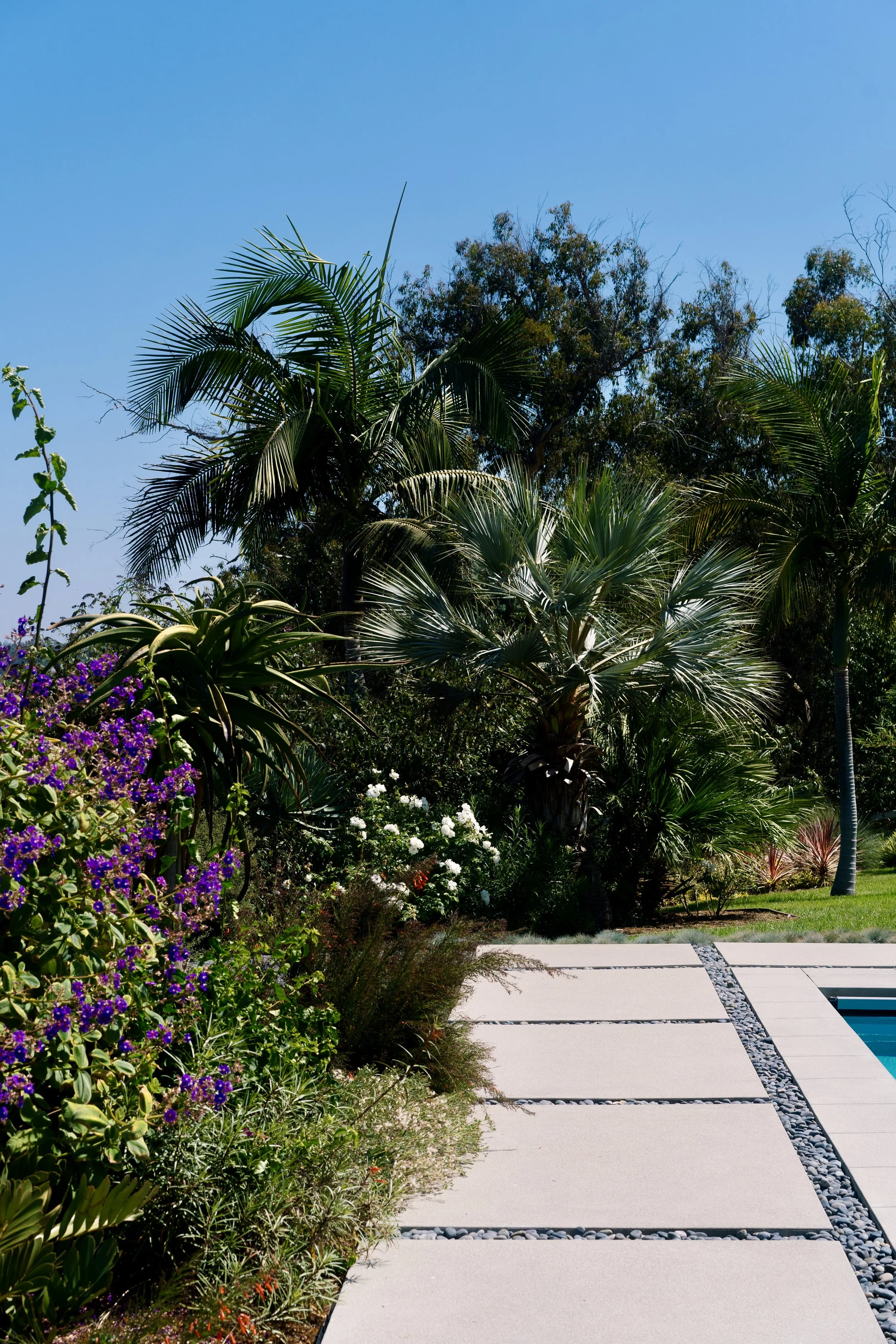 Southern California’s drought cycles made the decision easy. We removed 28,000 square feet of turf—replacing it with **decomposed granite hardscape and a curated collection of arid-climate plant specimens** from Mediterranean, Australian, and South African biomes. Think **Bismarck palm (*Bismarckia nobilis*)** with its striking steel-blue fan fronds, **Brahea armata (blue fan palm)** with its stiff, powder-blue foliage, **Bambusa chungii 'Changi' (tropical blue bamboo)** for its powdery blue canes, **Schizolobium parahyba (Brazilian fern tree)** with its massive, fern-like canopy and lightning-fast growth, **Archontophoenix alexandrae (king palm)** for its graceful, ringed trunk, **Bauhinia variegata (orchid tree)** with its orchid-like blooms, and **reliable disease-resistant roses** like 'Iceberg' and 'Knock Out' for repeat blooming. All thriving on rainfall plus minimal drip. The savings: roughly 1.2 million gallons per year, enough to fill two Olympic swimming pools.