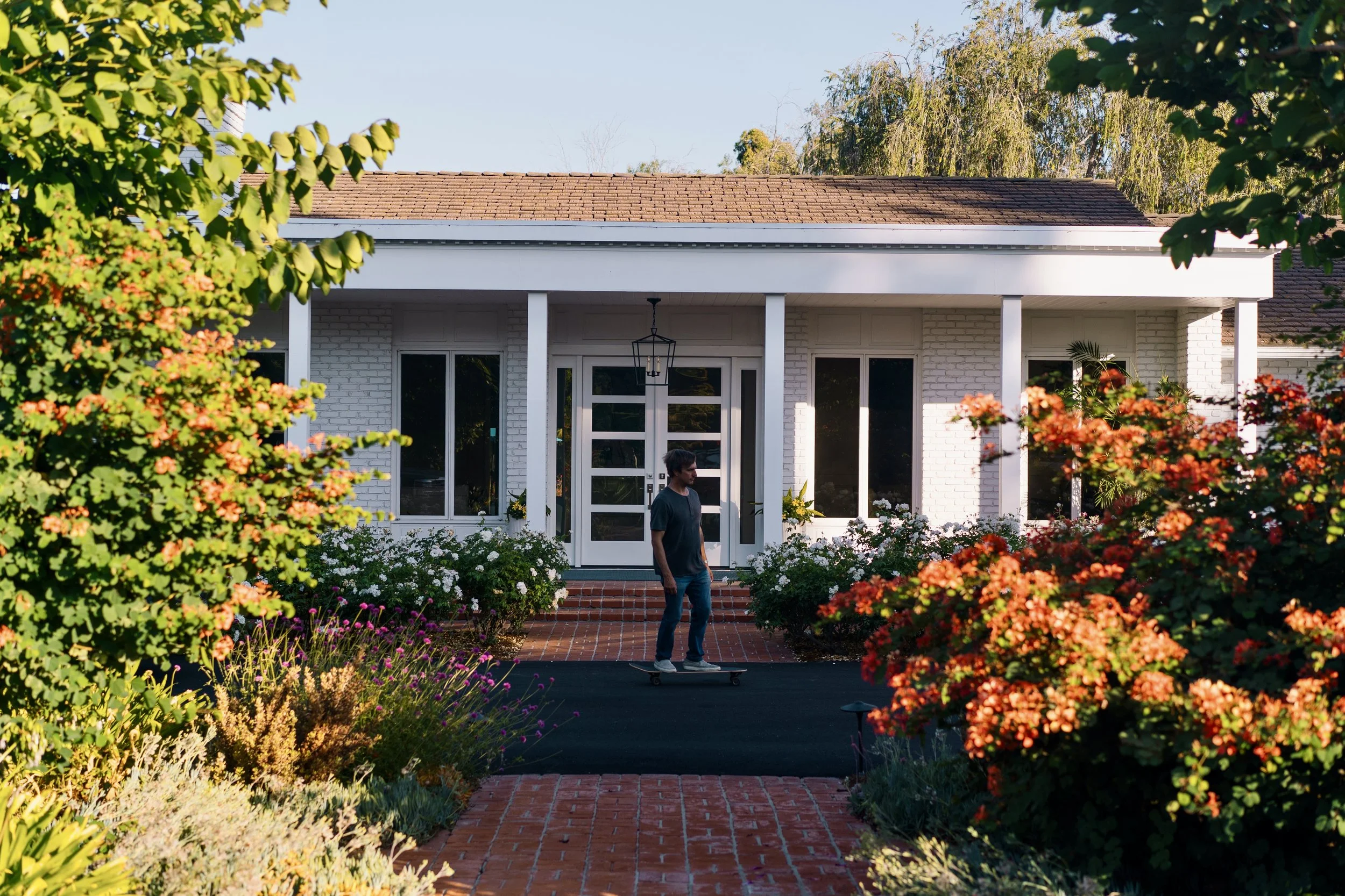 - **Exterior:** The original red brick façade was **coated in a breathable white lime-wash**, instantly modernizing the look while preserving the texture. We replaced all **front windows, entry doors, and rear sliding doors** with black steel-framed glass, creating seamless indoor-outdoor flow to the pool and garden hardscape.
